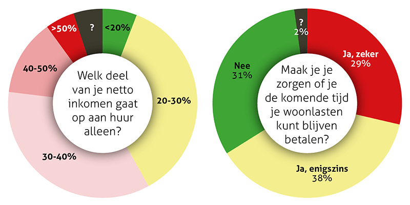 Van de ondervraagde leden zegt 35 procent meer dan 40 procent van het inkomen kwijt te zijn aan alles wat met wonen te maken heeft: huur, servicekosten, energie, water, lokale belastingen en overige woonkosten.